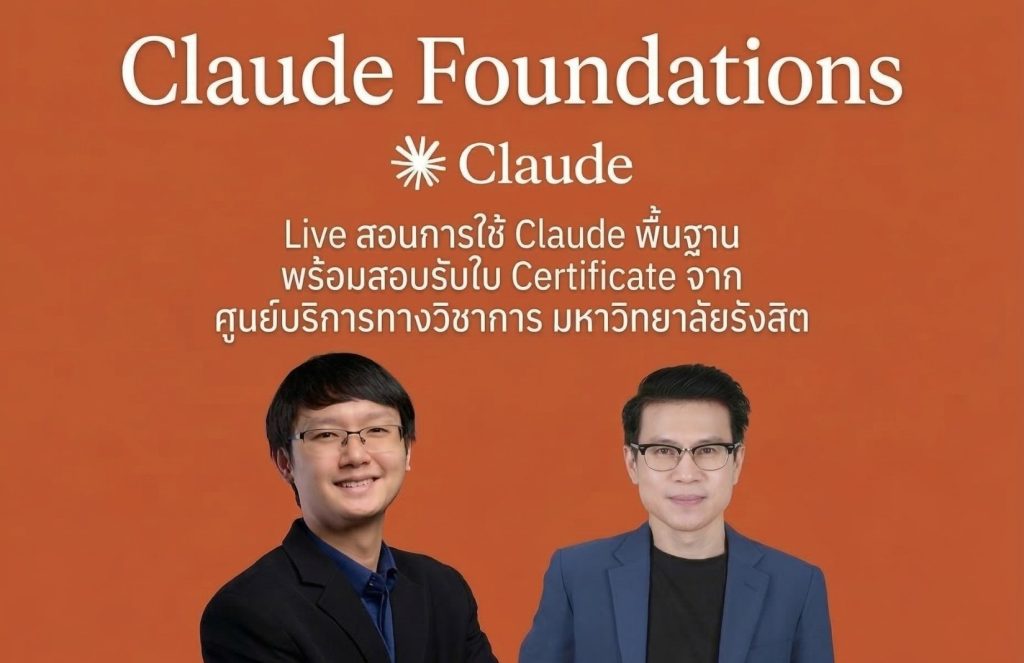 Claude Foundation Claude Foundation เรียนรู้การใช้ Claude ตั้งแต่พื้นฐานแนวคิดพื้นฐานของ Claude และการใช้งานวิธีใช้ Claude เพื่อช่วยงานจริงในชีวิตประจำวันตัวอย่างการใช้ AI ให้เกิดประโยชน์ในงานและธุรกิจ เปิดสำหรับนิสิต นักศึกษาและบุคคลทั่วไป สมัครเรียน Click ข้อมูลการสมัครเรียน ระยะเวลา : เรียนรู้ได้ตลอดเวลาระยะเวลาการเรียน : เรียนรู้ได้ทุกเวลาค่าใช้จ่ายตลอดหลักสูตร : ฟรีหน่วยงาน : ศูนย์บริการทางวิชาการ มหาวิทยาลัยรังสิตรูปแบบการเรียน : เรียน Online ในรูปแบบ VDOเว็บไซต์ : https://cyberumooc.rsu.ac.th/ภาษา : ภาษาไทย เข้าสู่ระบบเรียน วัตถุประสงค์ของคอร์สเรียนนี้ เข้าใจพื้นฐาน: เข้าใจหลักการทำงานของ Claude AI อย่างถูกต้องใช้งานเป็น: เขียนคำสั่ง (Prompt) เพื่อสั่งงาน Claude ได้อย่างมีประสิทธิภาพประยุกต์ใช้จริง: นำไปใช้ช่วยงานในชีวิตประจำวันและเพิ่มโอกาสทางธุรกิจได้ทันที คุณสมบัติผู้เรียน มือใหม่: ผู้ที่ต้องการเริ่มใช้ AI แต่ไม่มีพื้นฐานมาก่อนคนทำงาน/เจ้าของธุรกิจ: ผู้ที่ต้องการใช้ AI เป็นผู้ช่วยเพื่อเพิ่ม Productivityผู้สนใจทั่วไป: ไม่จำกัดสาขาอาชีพ ขอแค่มีทักษะคอมพิวเตอร์เบื้องต้น ติดต่อสอบถามข้อมูลเพิ่มเติมได้ที่ ดร.ปวีณา สุจริตธนารักษ์ (โอ) 0-2997-2222 ต่อ 3242email : cyberu@rsu.ac.th